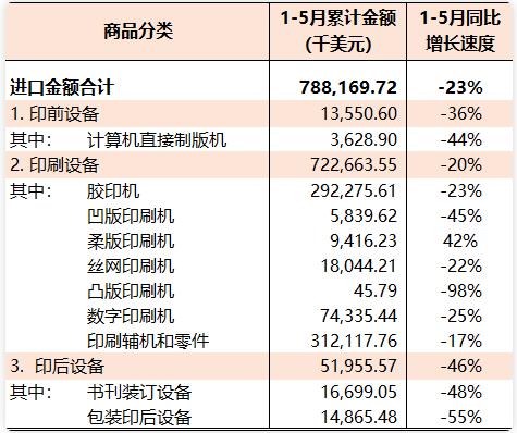 同期,相關(guān)印刷品主要子項出口,字典書籍類印刷品4.70億美元(同比增長23%)、期刊雜志類印刷品219.03萬美元(同比下降39%)、兒童圖畫書類印刷品2.98億美元(同比增長20%)、瓦楞紙盒(箱)7.78億美元(同比增長12%)、非瓦楞紙折疊紙盒8.60億美元(同比增長13%)、紙袋7.44億美元(同比增長34%)、辦公類印刷品13.89億美元(同比增長30%)、票證類印刷品2462.09萬美元(同比下降58%)、其他商業(yè)印刷品8.72億美元(同比增長13%)。 2022年1-5月國內(nèi)印刷品進(jìn)出口貿(mào)易順差49.44億美元(同比增長25%)。 印刷裝備 2022年1-5月國內(nèi)印刷裝備進(jìn)口7.88億美元(參見表10),與去年同期相比下降23%。其中,印前設(shè)備進(jìn)口1355.06萬美元(同比下降36%)、印刷設(shè)備進(jìn)口7.23億美元(同比下降20%)、印后設(shè)備進(jìn)口5195.56萬美元(同比下降46%)。 表10 2022年1-5月國內(nèi)印刷裝備進(jìn)口統(tǒng)計