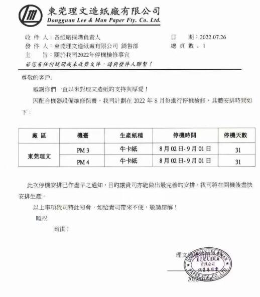 其中,廣東基地的箱板紙機PM52將從7月27日起停機7天,該臺紙機于今年5月份投產,設計年產能超60萬噸;位于福建的華南基地共有4臺紙機將在8月份停機,時長為15-31天;華中、浙江、安徽基地各有1臺紙機計劃停機,時長為7-10天。 玖龍、山鷹均有停機計劃,同樣被稱為包裝紙行業龍頭的理文造紙自然亦是如此。同日,理文造紙旗下東莞理文宣布,因配合機器設備維修保養,計劃在8月份對兩臺紙機停機檢修。 具體而言,東莞理文的PM3、PM4均將在8月2日-9月1日期間停機檢修,停機天數長達31天。這兩臺紙機專門生產牛卡紙,若停機一個月,預計將影響產能超5萬噸。