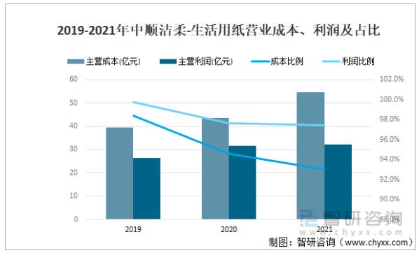 資料來(lái)源:公司年報(bào)、智研咨詢(xún)整理 2021年中順潔柔-生活用紙營(yíng)業(yè)成本為54.56億元,同比增長(zhǎng)25.6%,成本比例為93.05%;中順潔柔-生活用紙主營(yíng)利潤(rùn)為32.03億元,同比增長(zhǎng)1.5%,成本比例為97.44%。 2019-2021年中順潔柔-生活用紙營(yíng)業(yè)成本、利潤(rùn)及占比