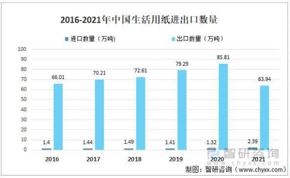 資料來(lái)源:中國(guó)造紙協(xié)會(huì)、智研咨詢(xún)整理 一、生活用紙進(jìn)出口情況 國(guó)際生活用紙價(jià)格保持高位對(duì)國(guó)內(nèi)造紙行業(yè)產(chǎn)生了微妙影響。據(jù)中國(guó)海關(guān)數(shù)據(jù),2021年中國(guó)生活用紙進(jìn)口數(shù)量為2.39萬(wàn)噸,同比增長(zhǎng)81.1%;生活用紙出口數(shù)量為63.94萬(wàn)噸,同比下降25.5%。 2016-2021年中國(guó)生活用紙進(jìn)出口數(shù)量