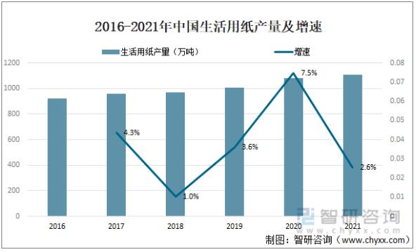 生活用紙指為照顧個(gè)人居家,外出等所使用的各類(lèi)衛(wèi)生擦拭用紙,包括卷筒衛(wèi)生紙、抽取式衛(wèi)生紙、盒裝面紙、袖珍面紙、手帕紙、餐巾紙、廚房用紙、濕巾、擦鞋紙、擦手紙等。2021年中國(guó)生活用紙產(chǎn)量為1107.6萬(wàn)噸,同比增長(zhǎng)9.1%。 2016-2021年中國(guó)生活用紙產(chǎn)量及增速