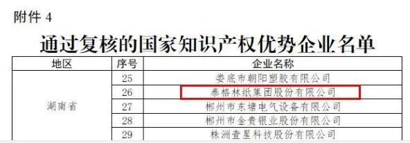 近日,國(guó)家知識(shí)產(chǎn)權(quán)局發(fā)布“關(guān)于確定2022年第一批及通過(guò)復(fù)核的國(guó)家知識(shí)產(chǎn)權(quán)示范企業(yè)和優(yōu)勢(shì)企業(yè)通知”,泰格林紙順利通過(guò)國(guó)家知識(shí)產(chǎn)權(quán)優(yōu)勢(shì)企業(yè)復(fù)核。