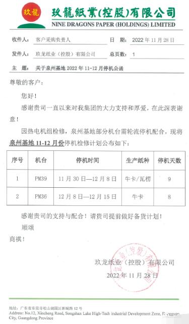 因熱電機(jī)組檢修,泉州玖龍兩臺(tái)箱板瓦楞紙機(jī)將從11月30日起分別輪停8-9天,按照設(shè)計(jì)產(chǎn)能計(jì)算,預(yù)計(jì)減產(chǎn)約1.6萬噸。