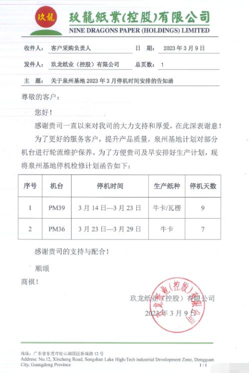 雖然玖龍紙業(yè)在2月初結(jié)束了春節(jié)停機檢修,但是隨著節(jié)后市場價格不斷走低,玖龍多個基地再度陸續(xù)停機。在泉州玖龍此次發(fā)布停機函前,東莞玖龍和重慶玖龍已經(jīng)開展了輪停,預(yù)計這兩個基地2月和3月將合計減產(chǎn)近14.6萬噸。