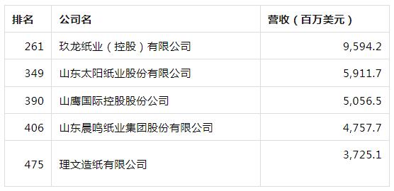 7月25日,《財富》雜志發布了2023年中國500強排行榜。其中,玖龍紙業控股有限公司、理文造紙有限公司、山鷹國際控股有限公司、山東晨鳴紙業集團股份有限公司、山東太陽紙業股份有限公司等多家造紙企業上榜。