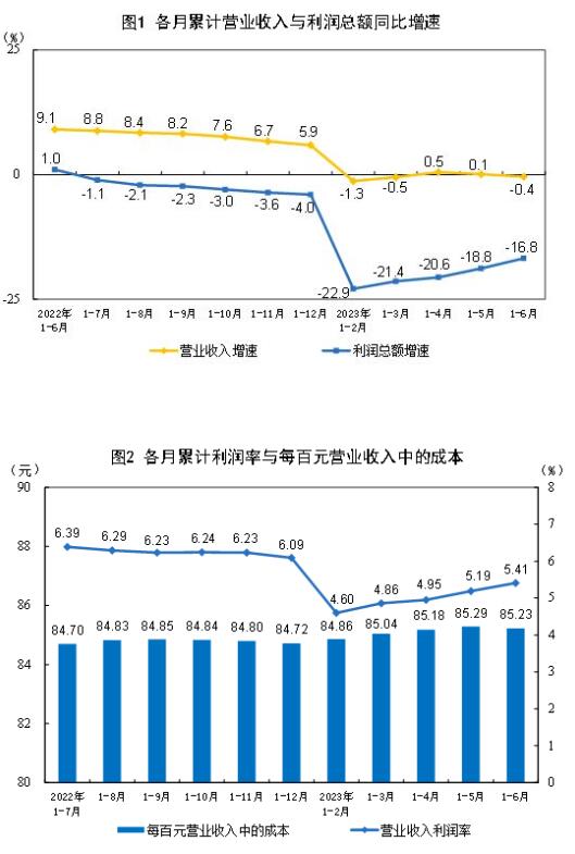 1—6月份,規模以上工業企業實現營業收入62.62萬億元,同比下降0.4%;發生營業成本53.37萬億元,增長0.5%;營業收入利潤率為5.41%,同比下降1.07個百分點。其中,造紙和紙制品業實現營業收入6523.9億元,同比下降5.5%;印刷和記錄媒介復制業實現營業收入3044.6億元,同比下降6.6%。 6月末,規模以上工業企業資產總計160.31萬億元,同比增長6.6%;負債合計92.28萬億元,增長6.7%;所有者權益合計68.04萬億元,增長6.3%;資產負債率為57.6%,同比上升0.1個百分點。 6月末,規模以上工業企業應收賬款22.72萬億元,同比增長10.6%;產成品存貨6.05萬億元,增長2.2%。 1—6月份,規模以上工業企業每百元營業收入中的成本為85.23元,同比增加0.81元;每百元營業收入中的費用為8.34元,同比增加0.25元。 6月末,規模以上工業企業每百元資產實現的營業收入為79.1元,同比減少6.2元;人均營業收入為173.6萬元,同比增加5.1萬元;產成品存貨周轉天數為20.3天,同比增加1.1天;應收賬款平均回收期為63.2天,同比增加6.4天。 6月份,規模以上工業企業實現利潤總額7197.6億元,同比下降8.3%。 國家統計局工業司統計師孫曉解讀工業企業利潤數據表示,今年以來,隨著推動經濟持續回升向好各項政策措施落地顯效,工業生產穩步恢復,企業盈利逐月改善,工業企業效益狀況呈現以下主要特點:工業企業利潤穩步恢復。七成以上行業盈利較一季度改善,制造業盈利改善明顯。裝備制造業累計利潤增速由負轉正。消費品制造業利潤加快回升。電氣水行業利潤持續增長。不同類型企業利潤均有改善,小型、私營、外資企業改善明顯。企業單位成本邊際改善,利潤率環比回升。總體看,工業企業利潤延續恢復態勢。