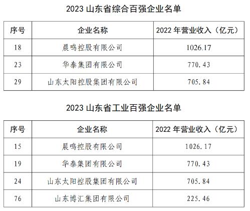 10月11日,山東省工業(yè)和信息化廳公示了2023山東省綜合百?gòu)?qiáng)企業(yè)名單、工業(yè)百?gòu)?qiáng)企業(yè)名單。晨鳴控股有限公司、華泰集團(tuán)有限公司和山東太陽(yáng)控股集團(tuán)有限公司分別位列“2023山東省綜合百?gòu)?qiáng)企業(yè)”第18位、第23位和第29位。同時(shí),3家企業(yè)和山東博匯集團(tuán)有限公司上榜“2023山東省工業(yè)百?gòu)?qiáng)企業(yè)”,分別位列第15位、第19位、第24位和第76位。