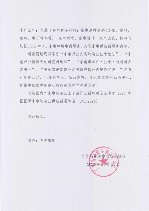 附件:展會概況 一、展會名稱 中國國際家電制造業供應鏈博覽會 全國家電零部件、技術、材料、制造設備展覽會 廣東展:2024年8月13—15日地點:廣東潭洲國際會展中心 合肥展:2024年9月25—26日地點:合肥白金漢爵大酒店 二、展會介紹 中國是全球最大的家電制造和研發中心,中國家電整體產能占全球70%。近年來,隨著世界各國人們生活水平不斷提高,消費者對智能、綠色、健康、節能等新型家電需求與日俱增,這為我國家電企業提供了廣闊的市場空間,也對我國家電制造業加快技術創新和產品升級提出了更高要求。 為促進中國家電行業科技創新,提高家電行業核心競爭力,助力中國家電行業可持續高質量發展,廣東省家用電器行業協會聯合上海聞帆展覽有限公司、南京聞帆展覽有限公司將于2024年8月13—15日在廣東佛山,9月25—26日在安徽合肥舉辦2024中國國際家電制造業供應鏈展覽會(CAEE2024)。本屆展覽會將全面展示家電行業新技術、新材料、新工藝,以及各種家電零部件、配套件、家電附件;智能家電·智能家居·家庭物聯網技術;家電控制器、家電半導體、電子元器件;家電生產設備、裝配設備、生產工藝;包裝設備與包裝材料;家電原輔材料(金屬、塑料、玻璃、電子輔料等);家電研發、家電設計、家電試驗、檢測與認證、OEM加工、家電跨境電商服務、其它家電供應鏈服務商等。 展會同期還將舉辦“家電行業先進制造業技術論壇”、“家電產業鏈融合創新發展論壇”、“家電零部件·技術·材料新品發布會”、“中國家電制造業優秀供應商評選暨頒獎典禮”等系列配套活動,以展覽展示、新品發布、技術交流等活動為平臺,助推中國家電制造業持續引力世界先進水平。 三、展會主旨 促進中國家電制造業科技創新,助力中國家電行業可持續高質量發展 我們的目標是: 幫助供應鏈企業——找到更多買家 幫助家電制造企業——找到更優質供應商 四、組織機構 主辦單位:廣東省家用電器行業協會、上海聞帆展覽有限公司、南京聞帆展覽有限公司 支持企業:海爾集團公司、美的集團股份有限公司、珠海格力電器股份有限公司、西門子家電、美國西屋電氣公司、美國通用家電(GEAppliances)、美國惠而浦公司、博世家用電器集團、日本索尼公司、日本松下電器、東芝(中國)有限公司、韓國三星電子集團、韓國LG集團、日立(HITACHI)家電集團、日本三菱家電、伊萊克斯(Electrolux)中國有限公司、華為技術有限公司、小米科技有限責任公司、TCL實業控股股份有限公司、海信家電集團股份有限公司、康佳集團股份有限公司、長虹電器股份有限公司、奧克斯空調股份有限公司、合肥榮事達電子電器集團有限公司、創維集團有限公司、廣東格蘭仕集團有限公司、澳柯瑪股份有限公司、合肥晶弘電器有限公司、廣東奧馬冰箱有限公司、廣東萬和新電氣股份有限公司、廣東萬家樂燃氣具有限公司、寧波方太廚具有限公司、華帝股份有限公司、杭州老板電器股份有限公司、無錫小天鵝電器有限公司、科沃斯機器人公司、云鯨智能科技公司、石頭科技公司、追覓科技公司、iRobot機器人公司、曉舞掃地機器人公司等。 五、展會規模 參展企業:500+ 參觀觀眾:30000+ 展覽面積:30000㎡+ 六、VIP觀眾及特邀采購商 全球5萬多名專業觀眾和采購商,主要來自全國家電制造企業采購、技術、研發、設計、生產、工程等負責人、部門經理、采購經理、工程師、技術員、設計師、研發人員等:包括海爾、美的、格力、海信、TCL、康佳、長虹、華為、小米、創維、奧克斯、博世、西門子、松下電器、索尼、東芝、三星、LG、日立、三菱、三洋、夏普、飛利浦、西屋電氣、榮事達、格蘭仕、容聲、美菱、澳柯瑪、奧瑪、大金空調、小天鵝、小鴨、德意電器、海立電器、惠而浦、遠大、美大、森歌、方太、老板、華帝、帥康、櫻花廚衛、帥豐、德意、火王、阿里斯頓、林內、前鋒、蘇泊爾、九陽、萬和、萬家樂、AO史密斯、云米、萊克、愛仕達、艾美特、伊萊克斯、伊萊特、索伊、小熊電器、白雪電器、安吉爾、凈美仕、易開得、沁園、3M凈水、霍尼韋爾凈水、科勒、濱特爾凈水、阿詩丹頓、安之源、沁源、漢斯頓、阿里斯頓、布魯雅爾、亞都、戴森、綠島風、紐恩泰、中廣歐特斯、正理生能、芬尼克茲、科沃斯、云鯨、石頭科技、追覓、一點、曉舞、艾羅伯特等。 七、同期技術論壇——誠邀發言嘉賓 展會舉辦多場次高端家電技術論壇,屆時組委會將邀請國內外家電領域的知名專家、家電制造企業、供應鏈企業、媒體記者參加,就全球家電發展趨勢、家電新技術、新材料、新工藝的應用進行廣泛的交流和探討。組委會現面向全球誠邀大會發言嘉賓。 中國家電科技與創新大會 中國智能家電·智能家居技術論壇 中國家電新材料、新工藝、新技術推廣與應用論壇 中國家電行業先進制造技術論壇 八、參展范圍 家電新技術·新材料·新工藝 家電零部件、配套件、附件、結構件 智能家電·智能家居·家庭物聯網技術 家電控制器、電子元器件、芯片 外觀件、塑料件、鈑金件、五金件 家電制造與裝配技術設備 家電包裝技術設備與包裝材料 家電原輔材料(金屬、塑料、玻璃、磁材、電子材料等) 家電研發與家電設計 家電試驗與測試技術設備 檢測與認證服務 OEM加工 跨境電商服務