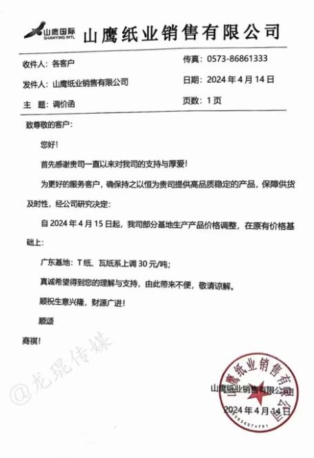 自2024年4月15日起,山鷹國際旗下廣東基地的T紙、瓦紙系將在原紙價格基礎上上調30元/噸。