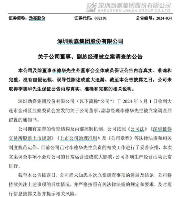 勁嘉股份5日公告,公司于2024年5月1日收到大連市金州區(qū)監(jiān)察委員會簽發(fā)的關(guān)于公司董事、副總經(jīng)理李德華被立案調(diào)查并留置的通知書。