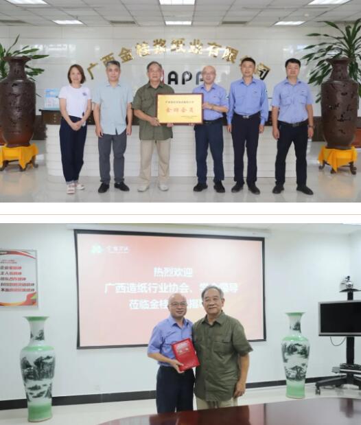 近日,廣西造紙行業協會秘書長黃顯南一行到金桂漿紙走訪交流,并為公司送上廣西造紙行業協會、廣西造紙學會“金牌會員”,廣西造紙行業協會“理事單位”,廣西造紙學會“副理事長”單位榮譽牌匾,為徐友君總經理頒發了“廣西造紙學會第十一屆理事會副理事長”榮譽證書。