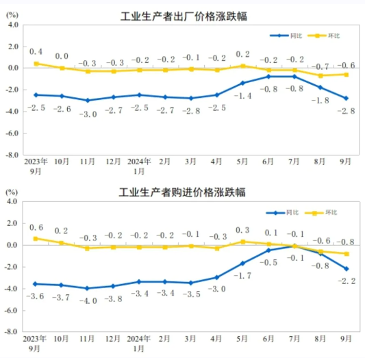 近日,國家統計局發布2024年9月份工業生產者出廠價格數據情況。9月份,全國工業生產者出廠價格同比下降2.8%,環比下降0.6%;工業生產者購進價格同比下降2.2%,環比下降0.8%。1—9月平均,工業生產者出廠價格比上年同期下降2.0%,工業生產者購進價格下降2.1%。