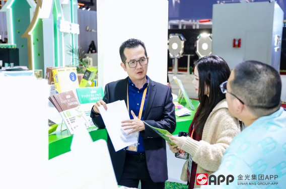 金光集團APP展臺引來觀眾駐足圍觀 除兩款升級展品外,APP王牌產(chǎn)品Cast Coated Arcadia 2000 & Concorde 高級涂布紙板、Golden Coin Embossed Brief Card壓紋紙、食品級防油紙、食品級紙吸管專用紙、高平滑食品級牛皮紙等在進博舞臺同樣吸引了大量興致勃勃的觀眾,加入到這段綠色旅程中來。