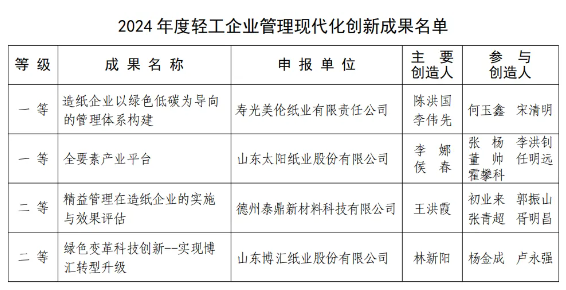 其中,山東太陽紙業(yè)股份有限公司、壽光美倫紙業(yè)有限責(zé)任公司榮獲2024年度輕工企業(yè)管理現(xiàn)代化創(chuàng)新成果一等獎(jiǎng),山東博匯紙業(yè)股份有限公司、德州泰鼎新材料科技有限公司榮獲2024年度輕工企業(yè)管理現(xiàn)代化創(chuàng)新成果二等獎(jiǎng)。