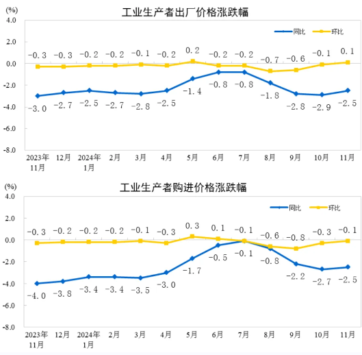 12月9日,國家統(tǒng)計(jì)局發(fā)布2024年11月份工業(yè)生產(chǎn)者出廠價(jià)格數(shù)據(jù)情況。11月份,全國工業(yè)生產(chǎn)者出廠價(jià)格同比下降2.5%,降幅比上月收窄0.4個(gè)百分點(diǎn),環(huán)比由上月下降0.1%轉(zhuǎn)為上漲0.1%;工業(yè)生產(chǎn)者購進(jìn)價(jià)格同比下降2.5%,環(huán)比下降0.1%。 1—11月平均,工業(yè)生產(chǎn)者出廠價(jià)格比上年同期下降2.1%,工業(yè)生產(chǎn)者購進(jìn)價(jià)格下降2.2%。