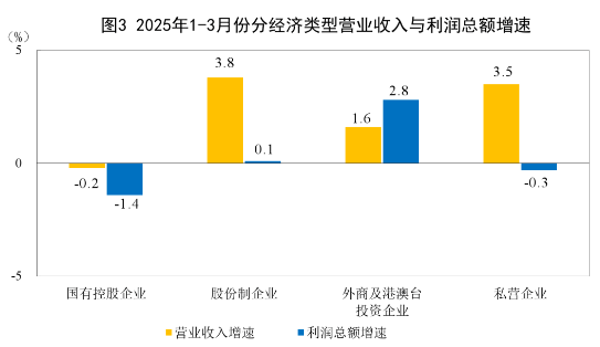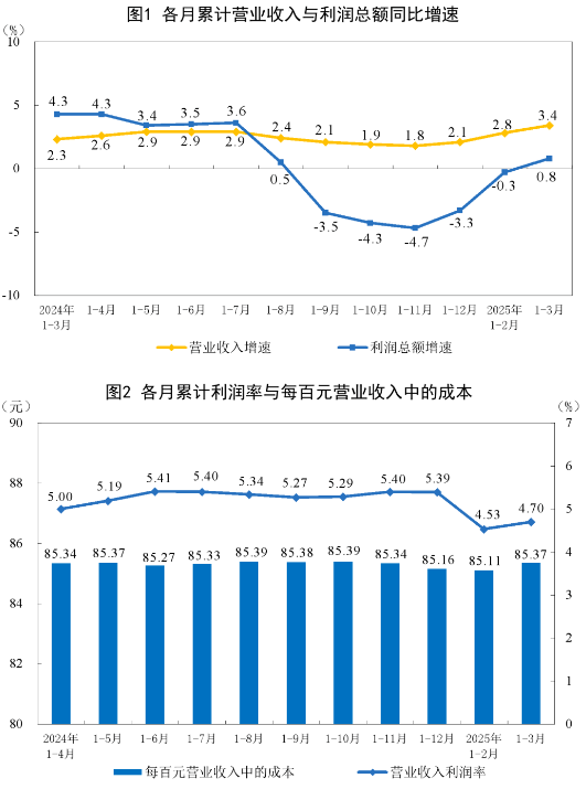 1—3月份,規(guī)模以上工業(yè)企業(yè)實現(xiàn)營業(yè)收入32.14萬億元,同比增長3.4%;發(fā)生營業(yè)成本27.44萬億元,增長3.6%;營業(yè)收入利潤率為4.70%,同比下降0.12個百分點。