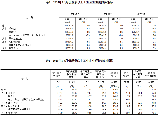 4月27日,國家統(tǒng)計局網(wǎng)站發(fā)布2025年1—3月份全國規(guī)模以上工業(yè)企業(yè)利潤情況。數(shù)據(jù)顯示,1—3月份,全國規(guī)模以上工業(yè)企業(yè)實現(xiàn)利潤總額15093.6億元,同比增長0.8%。