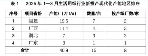 根據(jù)生活用紙專業(yè)委員會秘書處調研匯總,2025年1—3月,生活用紙行業(yè)新投產現(xiàn)代化產能約40.9萬t/a,共15臺紙機,包括國產紙機12臺,進口紙機3臺。今年第一季度新投產產能與去年同期(42.8萬t/a)相比,基本持平。 2025年第一季度新投產產能的地區(qū)分布見表1.