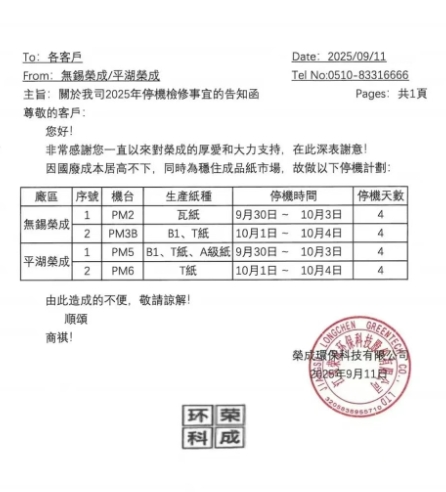 •淄博永豐環保科技有限公司 自2025年9月13日起,瓦楞紙、環保紙、牛卡紙價格在原有價格基礎上上調30元。 •山東仁豐特種材料股份有限公司 自2025年9月13日開始,瓦楞紙在原有價格基礎上上調30元/噸。 •玖龍紙業東莞基地 自九月十八日起,東莞基地地龍再生牛卡、江龍再生牛卡、玖龍瓦楞紙、地龍瓦楞紙上調RMB/HKD30元/噸(USD4元/噸)。 •浙江金龍再生資源科技股份有限公司、浙江金勵環保紙業有限公司 在目前的銷售價格基礎上,從2025年9月15日起,我公司生產的再生牛卡/高強瓦楞紙銷售價格上調30元/噸。 •上海珀菲特包裝科技有限公司 從2025年9月11日17:00時起,所有紙板訂單在原價格的基礎上上調3%。 •上海瑞邦紙品包裝有限公司 自2025年09月12日08:00起,所有紙板訂單價格在原有基礎上上調3%(包括多層紙板,二層紙板)。 •上海勇玖包裝材料有限公司 從2025年9月11日16:00時對所有客戶所下訂單價格上漲3%。 •山鷹紙業 自2025年9月13日起,在原有價格基礎上: 廣東基地:T紙、瓦紙上調30元/噸; 自2025年9月15日起,在原有價格基礎上: 福建基地:紅杉系、瓦紙系上調50元/噸; •五洲特紙 從2025年9月18日起,針對集團旗下包裝紙系列產品在現有價格基礎上,上調30元/噸。 •金田紙業(東莞) 自2025年09月15日起,對東莞市金田紙業有限公司所產的金泊牌再生牛卡紙、金泊牌高強瓦楞紙在原價格基礎上統一上漲30元/噸。 •金田紙業(四川) 自2025年9月16日起,對四川金田紙業有限公司所產的所有高強瓦楞紙在原價格基礎上統一上漲30元/噸。 •玖龍紙業太倉基地 自九月十八日起,瓦紙/Y紙/B紙/E紙/T紙在目前價格的基礎上上調RMB30元/噸。 造紙廠國慶停機計劃 •東莞金洲紙業有限公司
