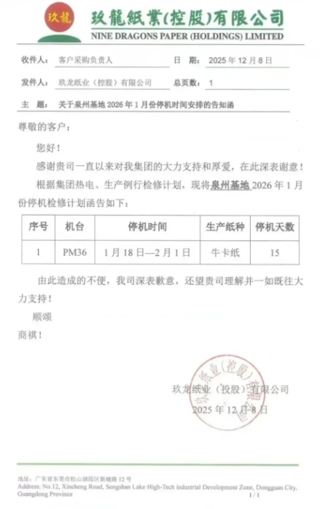 玖龍紙業泉州基地的PM36將從1月18日停機至2月1日,預計減產箱板紙1.3萬噸。此外,玖龍北海基地的PM48將在1月底減產約2.6萬噸箱板紙。