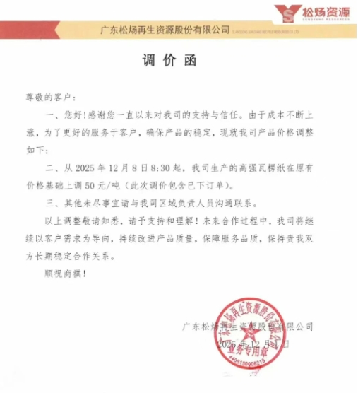 從12月8日8:30起,我司生產(chǎn)的高強(qiáng)瓦楞紙?jiān)谠袃r(jià)格基礎(chǔ)上調(diào) 50 元/噸(此次調(diào)價(jià)包含已下訂單)。